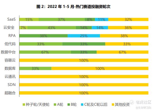 2022 年 1 月初至 5 月末累计各赛道投融资分布轮次比例如上,SaaS 与云安全赛道仍旧在覆盖种类和笔数上较为领先。在 5 月新增投资事件中,SaaS 赛道 1 笔为D1 轮,1 笔为战略投资,1 笔为股权投资。云安全新增两笔分别为天使轮和股权投资。数据中台新增 A、B 各一轮,数据库新增一笔被收购事件。综上,SaaS 赛道仍是投资热门赛道。