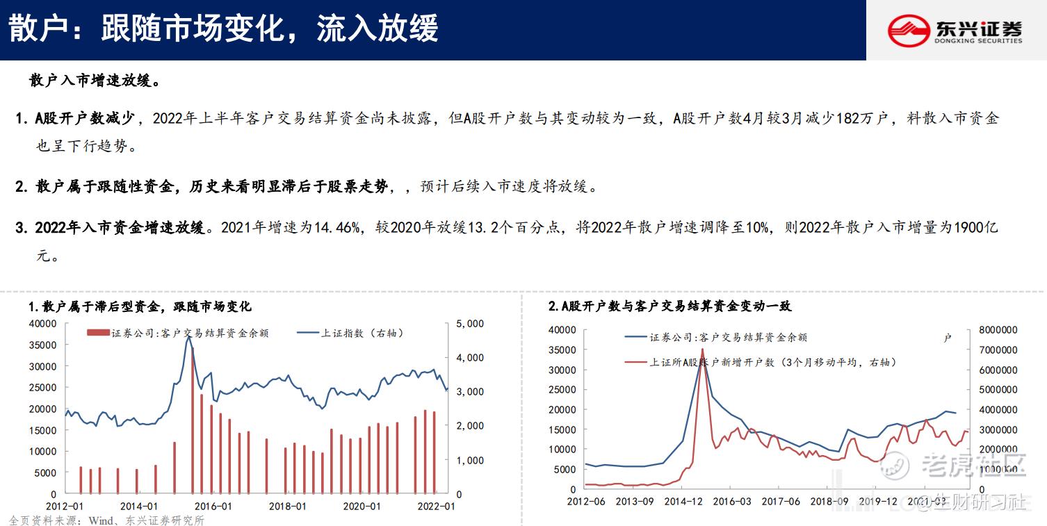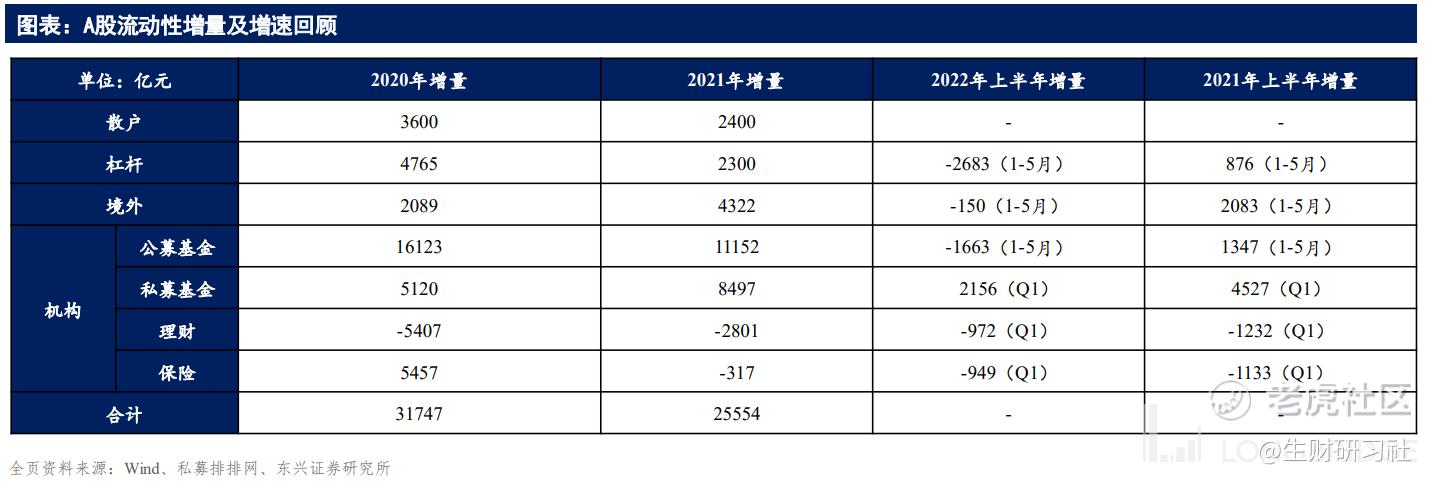 上半年股市资金整体流出。根据可比数据,22 上半年股市资金整体净流出,较 21 年同期少增约万亿元。 杠杆和公募流出规模最大,分别流出2683、1663亿元。私募基金维持流入态势,净流入2156亿元。理财、保险、境外资金虽净流出,但流出规模较小,分别流出972、949、150亿元。
