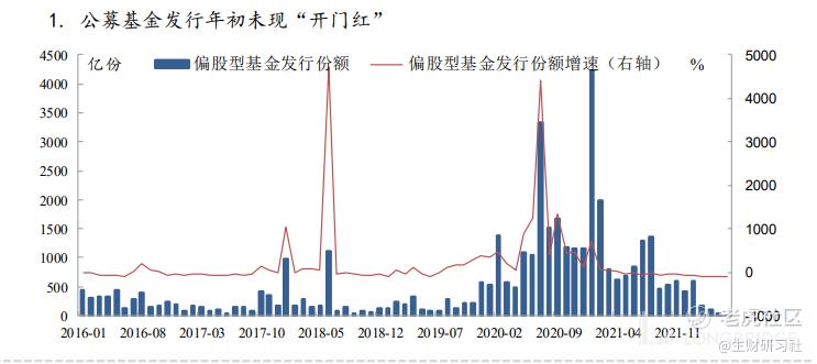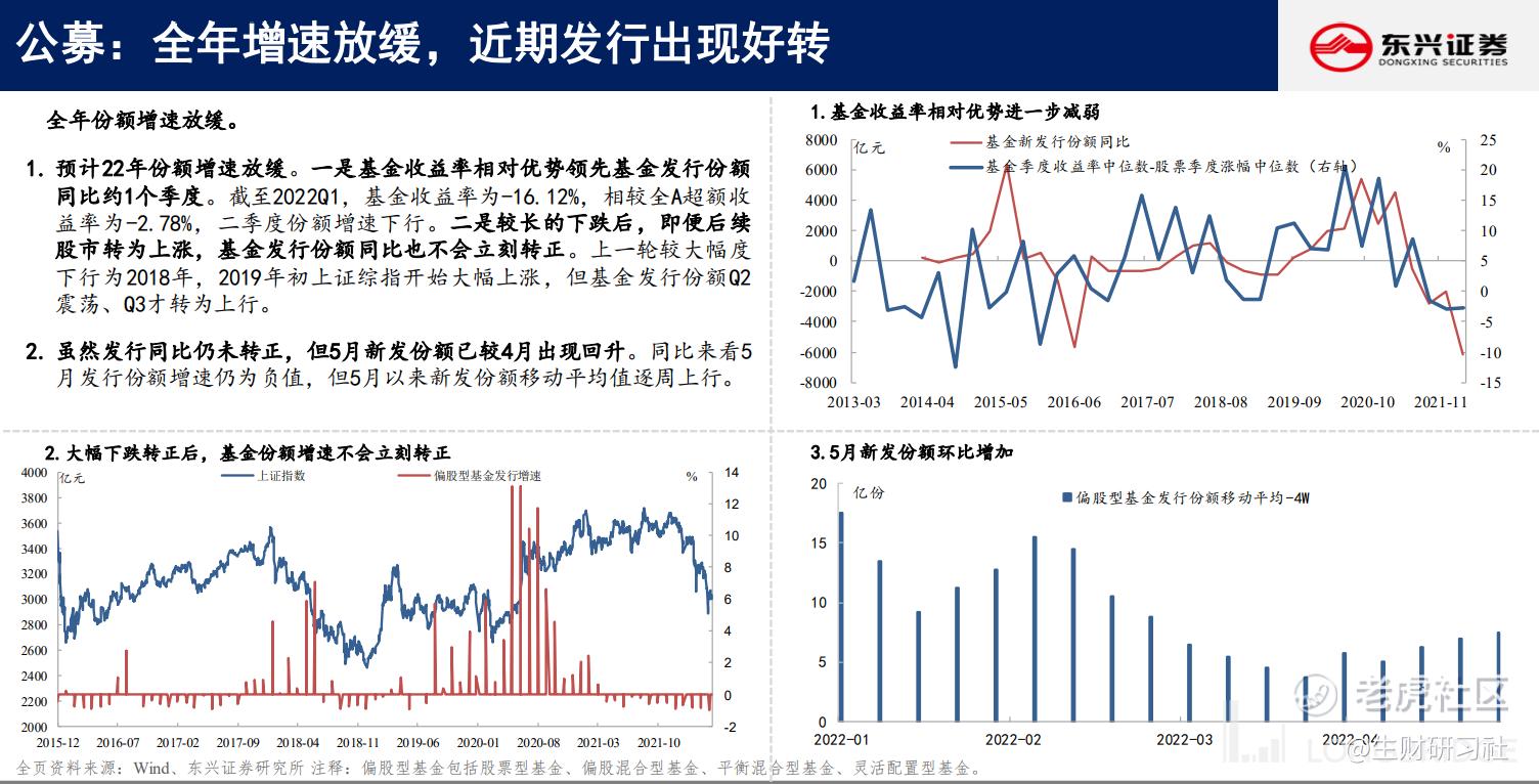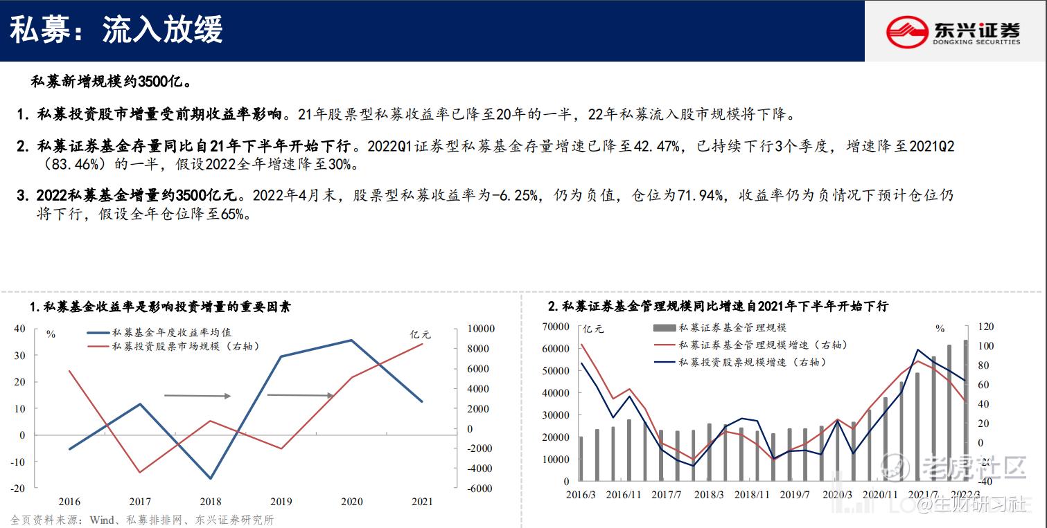 赚钱效应减弱导致公、私募同比少增。21 年末公、私募相对收益率均现下滑,年初发行份额增速即现下行,叠加 Q1 市场震荡,二者较 21 年同期少增幅度超 2000 亿。 21Q4“基金收益率中位数-股市涨幅中位数”为-2.96%。22年初偏股型基金发行份额增速降至-86.14%,4月份下降至-94.6%。