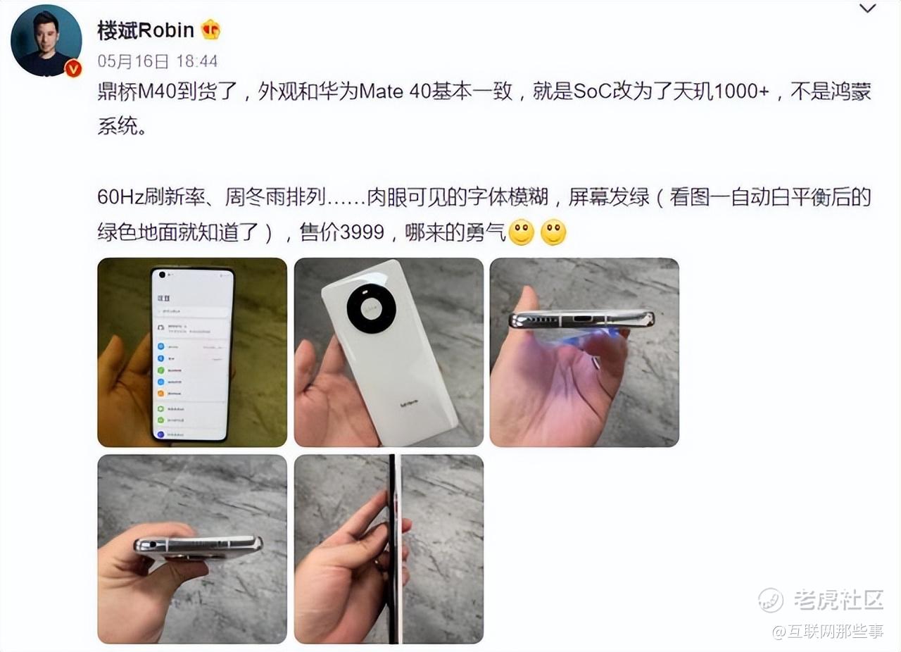 所谓解铃还需系铃人,我们不妨来看看鼎桥M40和华为Mate40系列的外观对比,好家伙,你但凡不是写轮眼,基本看不出来这两台手机的外观差异,甚至连红色电源键都一比一COPY,这华为能忍?可现状是,不但华为忍了,而且华为还包卖包售后,那只能理解为,华为将Mate40系列的外观模具设计一骨脑授权给鼎桥M40了,这也是“贴牌”的由来之一。