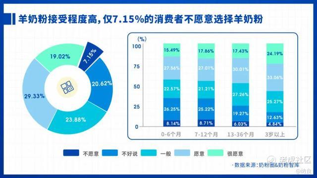 羊企的发力反应在消费者对羊奶的认知上,据据奶粉圈&奶粉智库的调研数据显示,消费者对羊奶粉的接受程度大幅度提高,不愿意选择羊奶粉的消费者仅有7.15%,有48.35%的消费者都表示愿意或很愿意选择羊奶粉。