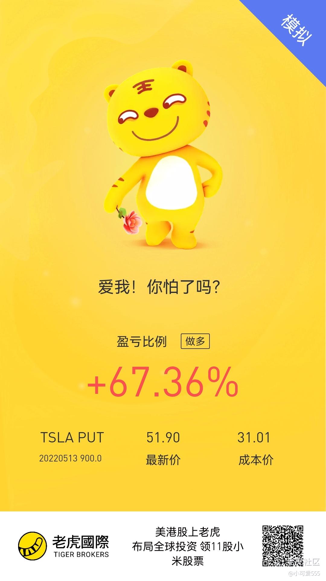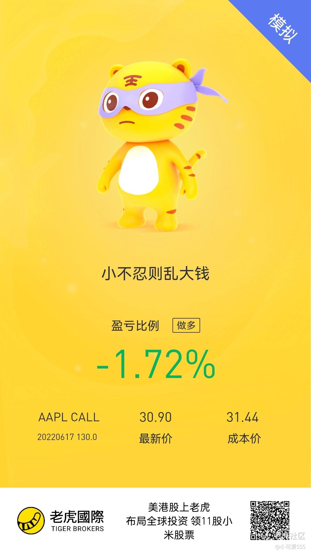 学习了期权知识和一些基础操作之后,趁着老虎app有期权模拟大赛,赶紧体验课了一把,老虎这期权模拟的功能真的是很好,对期权小白很友好,少走弯路少亏钱,感觉可以让我们上亏一个亿,又能学到期权操作技巧,毕竟投资都是有风险的,我们都需要谨慎一点。设心处地为虎友着想的良心券商😭