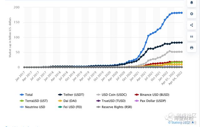 https://www.statista.com/statistics/1255835/stablecoin-market-capitalization/ )显示,截至今年4月4日,市值排名前十的稳定币的总市值就已突破1817亿美元,且这些稳定币皆为锚定美元,其市场发展规模和势头不容小觑。