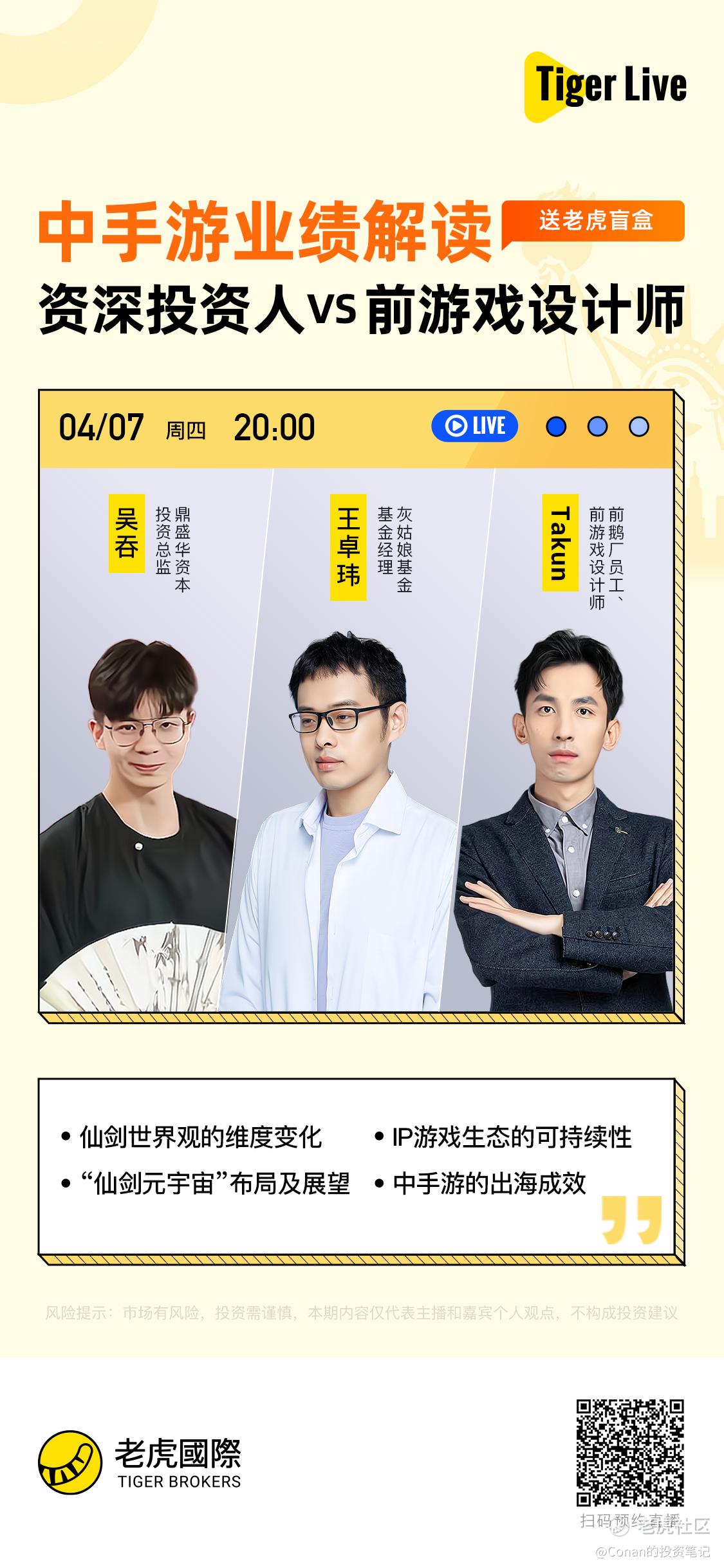 4月7日20:00,我将在老虎证券对中手游业绩进行解读,明天一起来深入了解一线从业人员眼中的中手游叭~