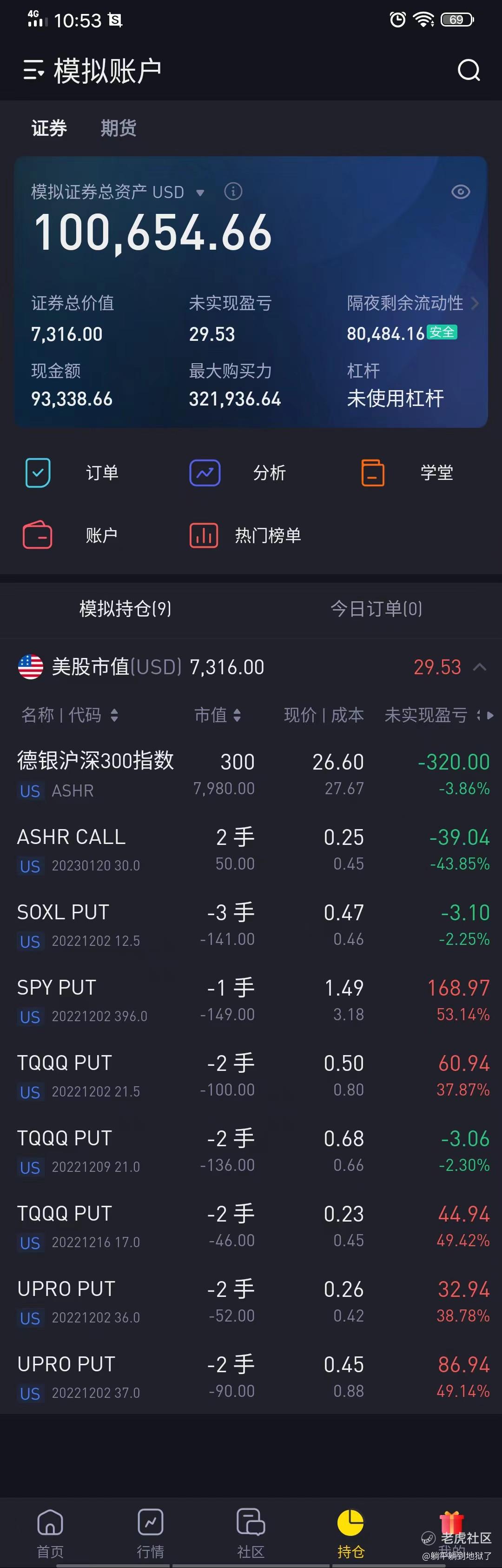 1、德银沪深300指数ETF(ASHR):期权流动性差,模拟盘挂市价单还成交不了。持仓获利后清仓将不再做为模拟盘的操作标的。依然看好ASHR中长期走势-----抄底中国优质资产的合适标的之一。