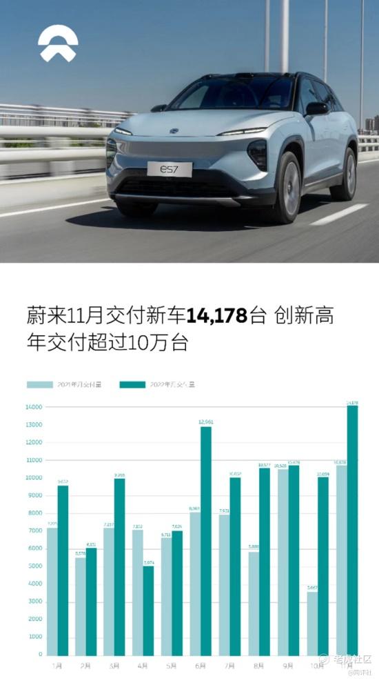 12月1日,各车企公布了11月销量。其中新势力“领头羊”蔚来交付新车14,178台,同比增长30.3%。这也是$蔚来(NIO)$ 继今年6月后,再度创下月度交付记录。