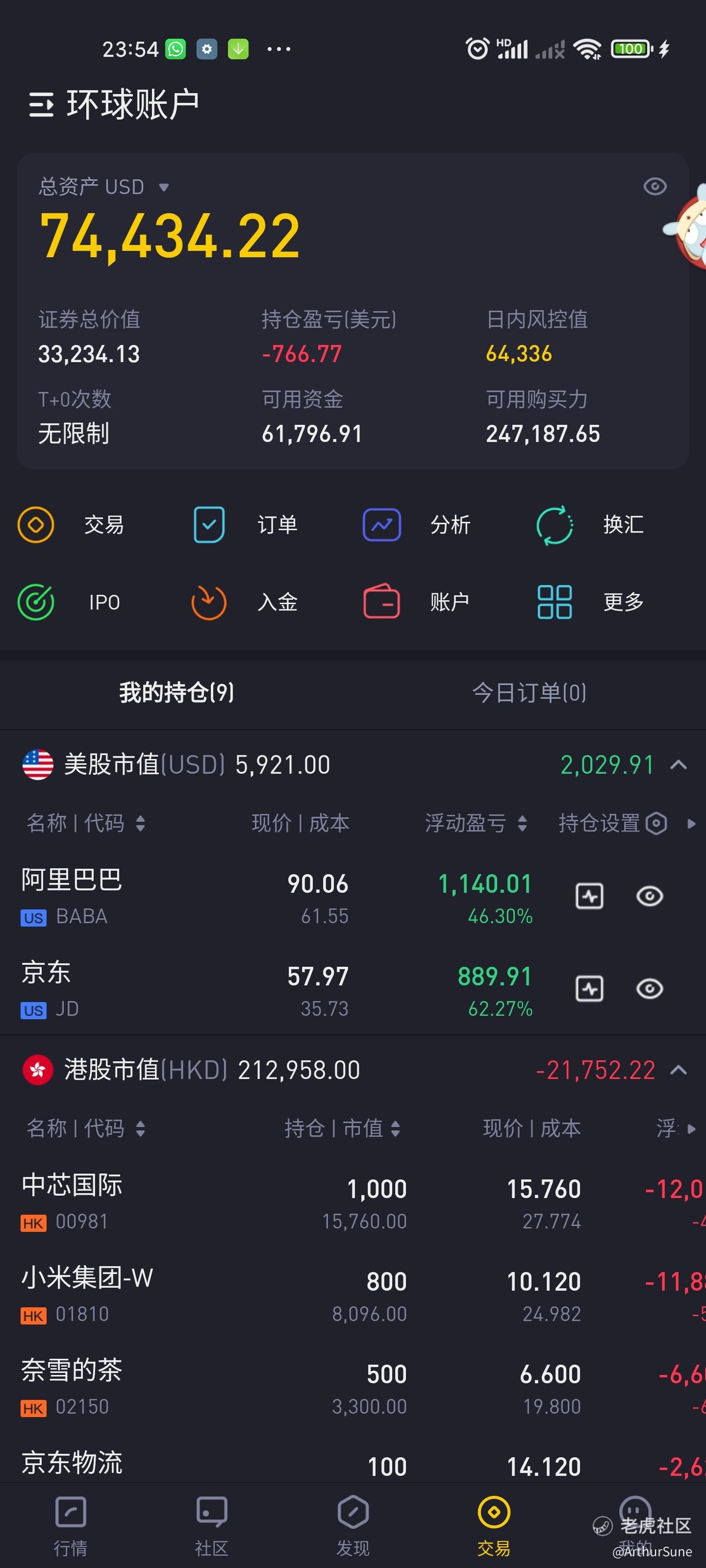 美股接上贴,最近新入的京东,以及加仓的阿里,入的这点量就是个观察仓而已,比例不低,但是仓位太低,怕了怕了,也没有时间做,厂里事太忙。这两只股票还是虎友@亿千 的推荐下操作的。感谢好兄弟[强] 。其实这两只获利后出了一部分了,口罩时代,采用稳健策略。