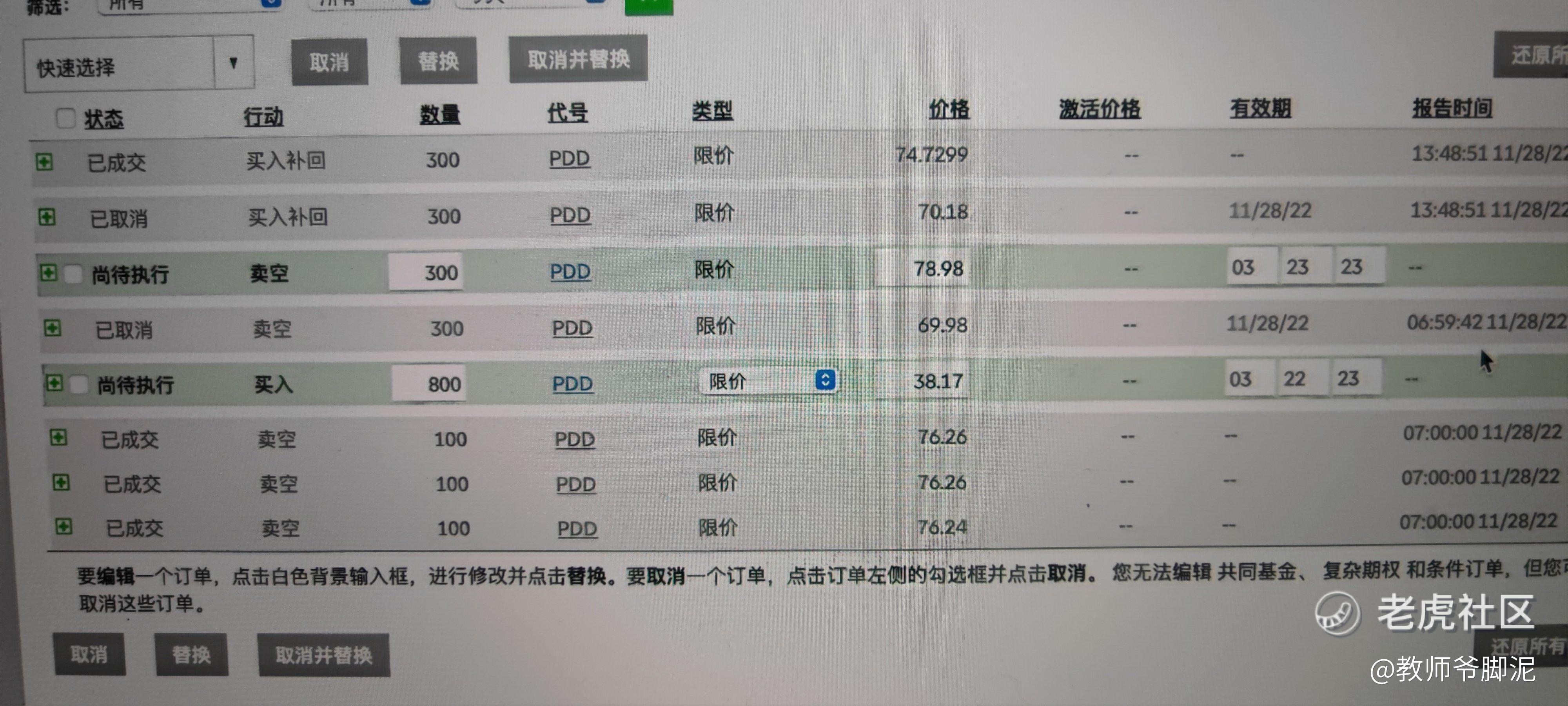 18秒。。。十万火急避免了惨剧的发生,有图有真相!两个卖空单,一个76.26美东时间7:00成交。发现一个69.98的卖空单,光速改为78.98。距离盘前7:00只有11.09秒,避免了悲剧发生。超级美妙!