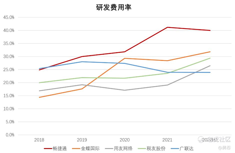 畅捷通云转型如此迅速,离不开其在研发端的大量投入。横向对比来看,畅捷通的研发费用率持续处于行业领先水平,并且近年来持续提升。今年上半年,畅捷通研发费用率高达40%,相比2018年的24.9%大幅提升。