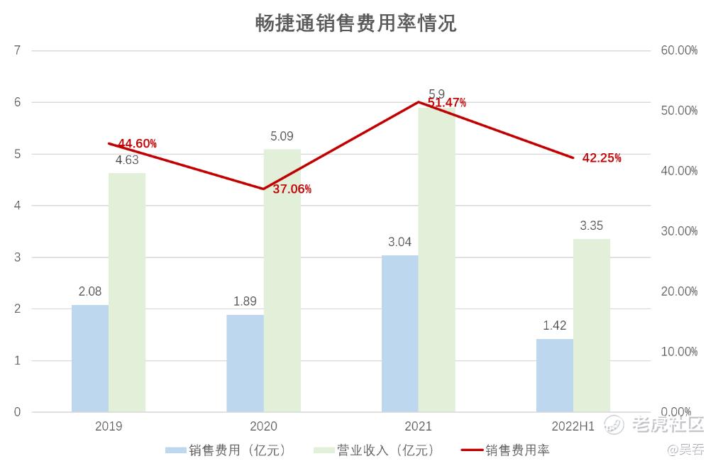 此外,截至22年年中和21年年中畅捷通集团员工总数分别为1189人和1122人,对应营收分别为3.35亿元与2.15亿元,由此算出今年上半年人均创收28.17万元,相比去年同期大幅提升了9万元。这说明销售人员在经历一年的熟悉后,创收能力有了明显提升。横向对比来看,金蝶国际上半年人均创收约19.1万元,同期也低于畅捷通。
