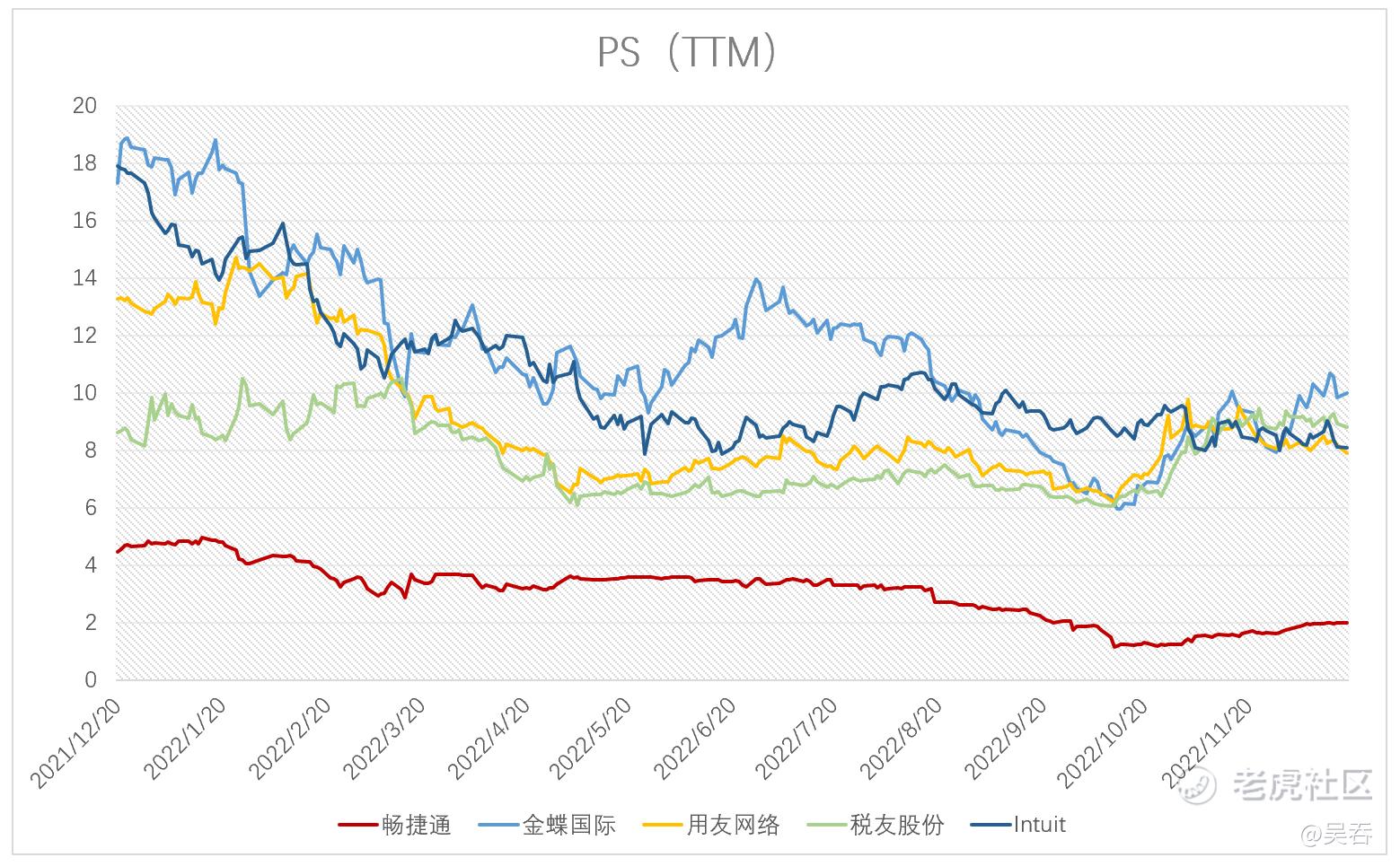 最后来看看估值,SaaS业务成长性明显,用PS估值,更能反应收入乘数对价格政策和企业战略变化敏感。可以看出,长期以来,畅捷通的估值显著低于可比企业。