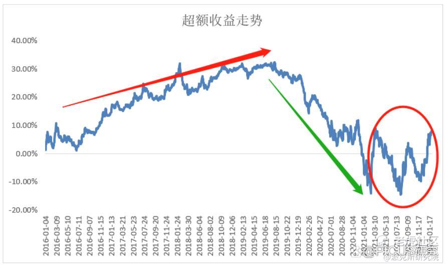 下图是2016年至今,价值风格基金指数相比于成长风格基金指数的超额收益走势图,走势向上表示那段时间市场上价值风格占优,走势向下表示成长风格占优。