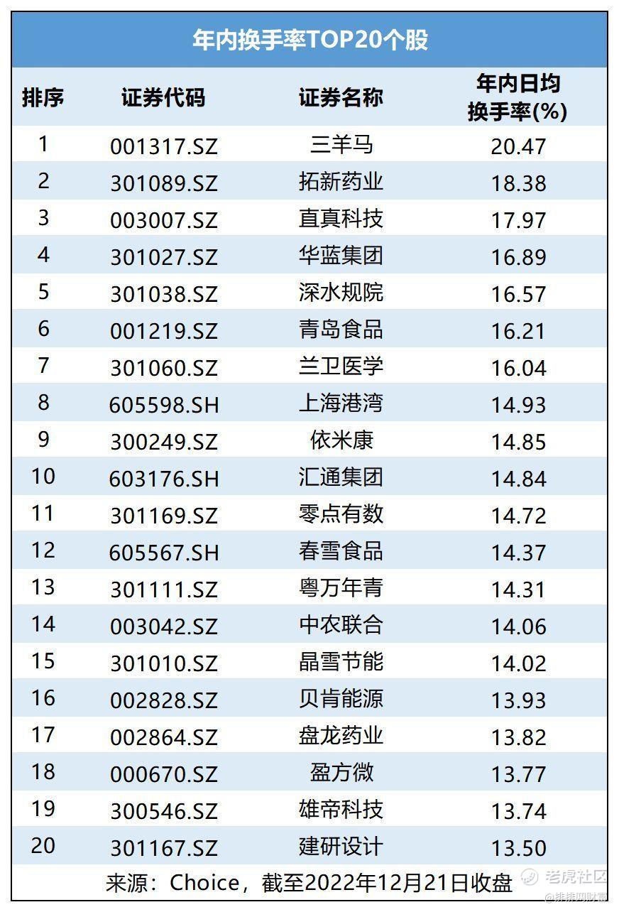 年内日均换手率最高的个股为三羊马,超过了20%,意味着大量资金在这只个股上有着较大的预期分歧。