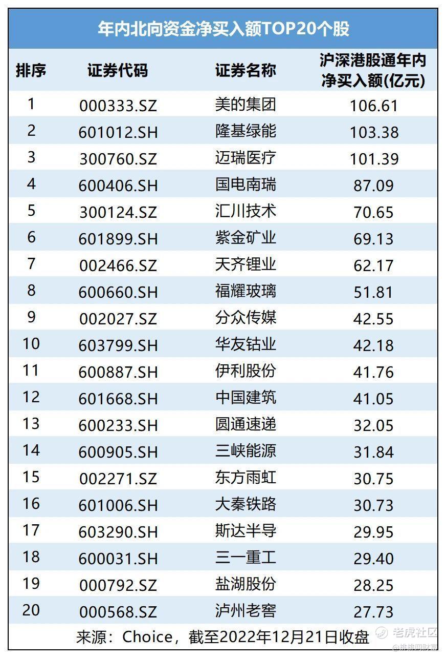 年内北向资金净买入额超百亿的个股共有3只,分别是家电龙头美的集团、光伏龙头隆基绿能和医疗器械龙头迈瑞医疗。