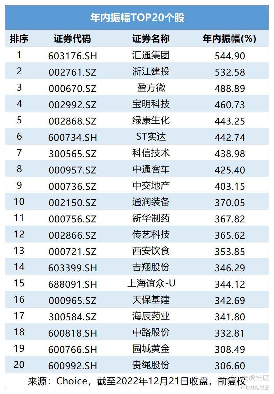 在振幅方面,年内振幅最大的两个只个股为汇通集团和浙江建投,振幅均超过500%。