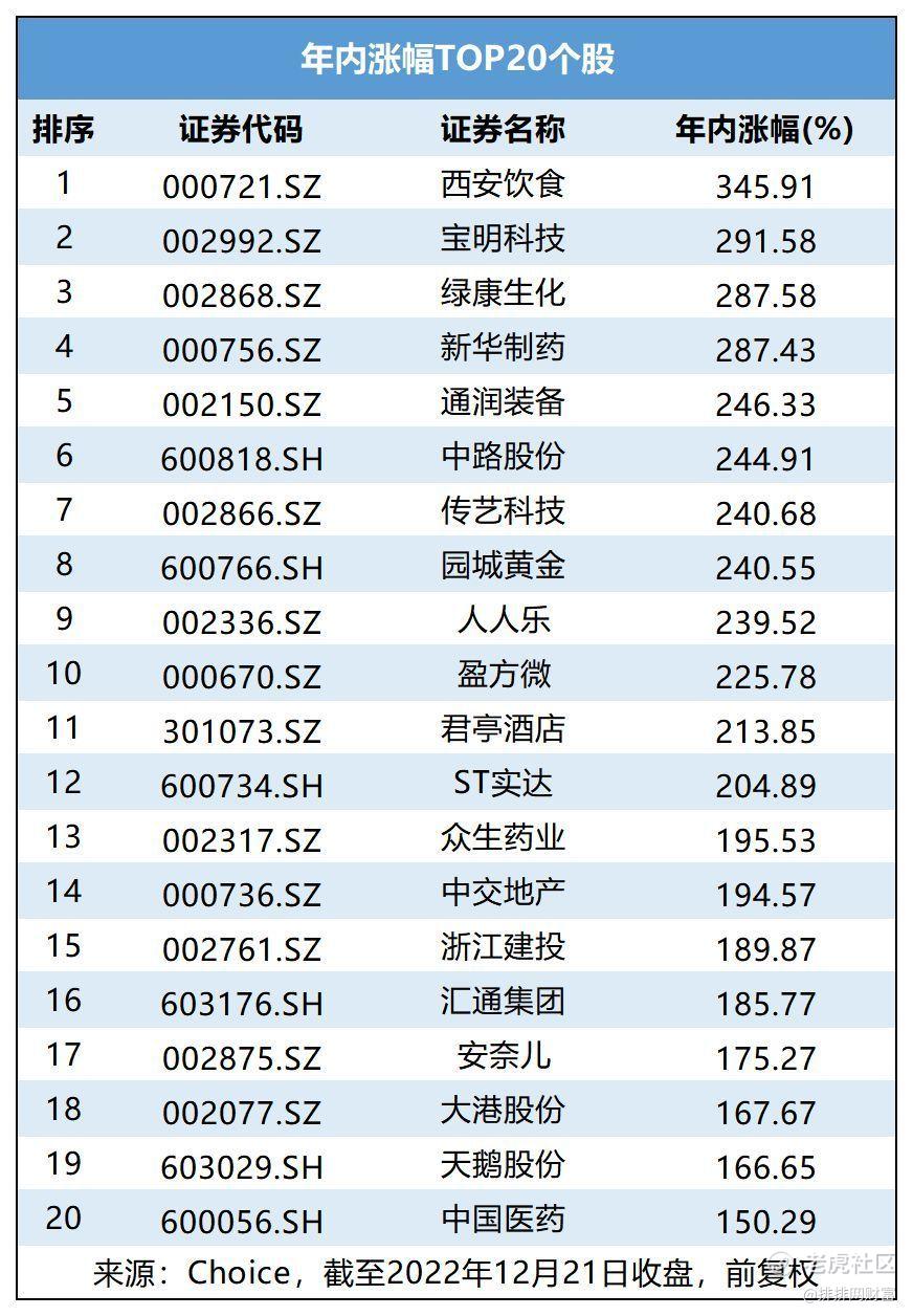 私募排排网依据Choice数据,以2022年12月21日收盘时的情况为基准,整理出了不同观察角度或维度下,表现居前的个股。需要注意的是,为确保数据的合理性,总体样本中剔除了2022年内上市的新股及次新股。
