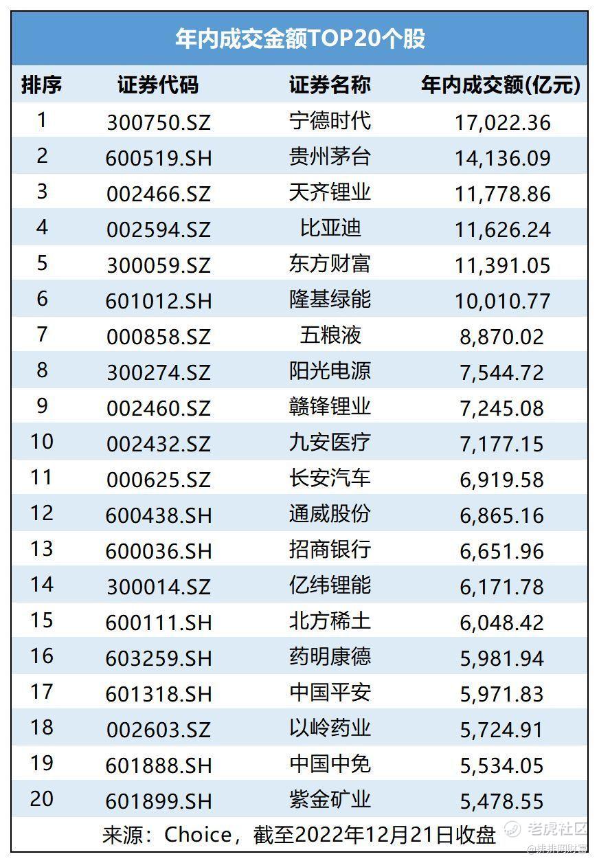 年内成交金额居前的个股基本都是大盘个股,其中成交额最多的个股为今年大热的个股“宁王”——宁德时代,累计成交超过1.7万亿元,这一累计成交额甚至超过了“股王”贵州茅台的1.41万亿元。