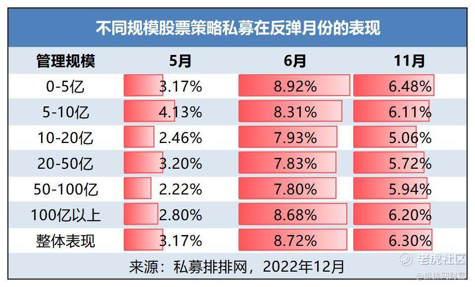 对应地,大规模私募往往因为交易成本和冲击成本较高而普遍存在“船大难掉头”的情况。然而事实却并非全然如此,私募排排网数据显示,百亿股票策略私募在6月和11月两个反弹月份的平均收益率分别为8.68%和6.20%,仅次于“灵活”的5亿以下私募,足以说明,百亿私募也是“抢反弹”的高手。