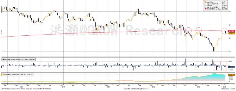 尽管市场对中国的情绪普遍回暖,股市一路高歌猛进,但数据显示,追踪恒指的最大ETF——盈富基金$盈富基金(02800)$ 的资金仍在外流(图表1)。随着恒指扶摇直上,该基金的累计资金流居然有所下降。考虑到目之所及的看涨情绪和南下资金通过互联互通的创纪录买入,这种资金流出之势着实出人意料。