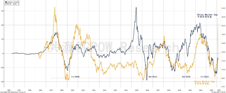 2022年10月底的市场底部是一个重要的底部。在图表5中,我们展示了恒指的估值和中国市场的总市值都在那段时间并行见底。这两项指标于2008年11月、2016年6月、2020年3月以及2022年10月都展现出精准定位历史性市场底部的能力。
