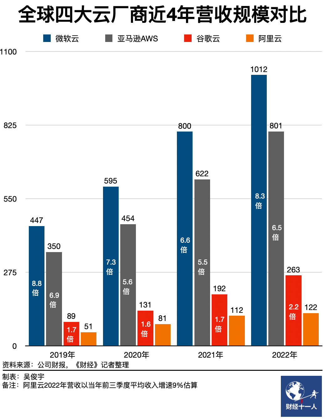 对比中美头部云厂商,2022年差距正在进一步拉大。2021年微软云营收是阿里云营收的6.6倍。2022年前三季度,这一数据扩大为8.7倍。