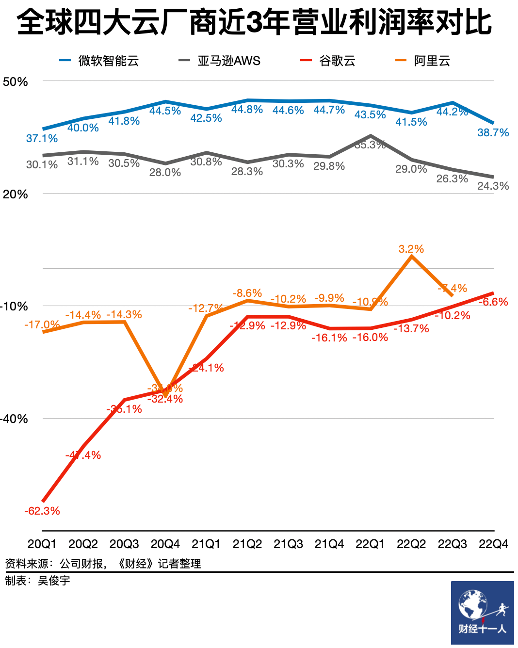 中美国云厂商的营收、利润长期存在差距。双方国情不同,业务不同,且不在同一条水平线。(详见《财经十一人》2022年2月12日《美国三大云巨头高增长真相》)