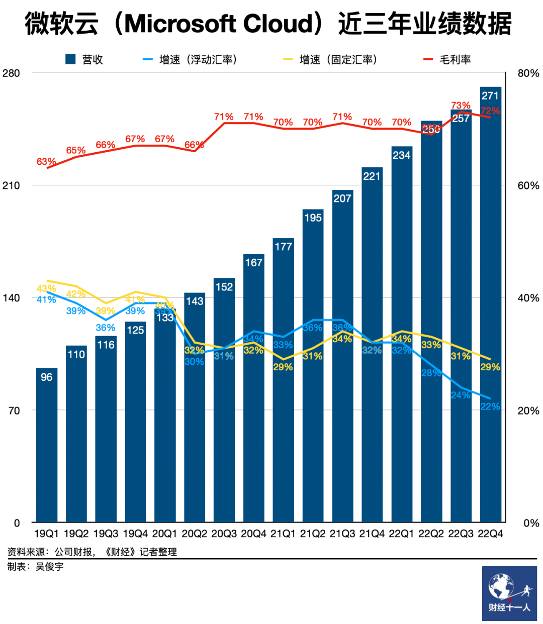 即使排除汇率因素影响,亚马逊AWS收入增速也难回到30%的增速区间。相比之下,2022年微软云的收入增速稳定在30%左右(排除汇率因素影响)。此外,微软云的营业利润率比亚马逊AWS高约15%。