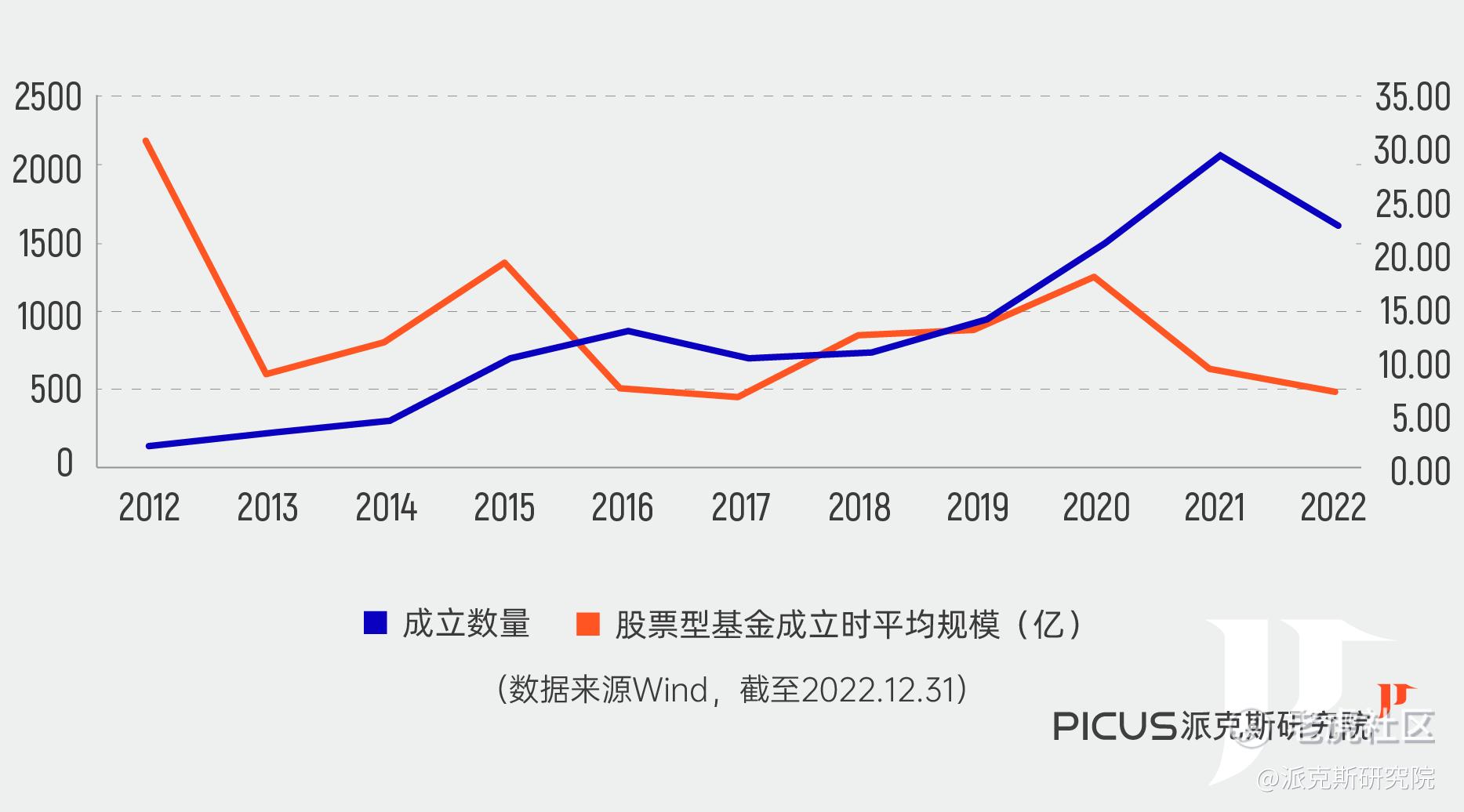 2022年,公募基金成立数量、成立时的规模与之前相比均有一定程度的下滑,市场投资热度并不高。新成立公募基金1539只,虽创下历史第二高值,但需要注意的是,股票型基金成立时平均规模仅约5.5亿元,在过去十余年中仅高于2017年,这是否意味着市场过于悲观了呢?