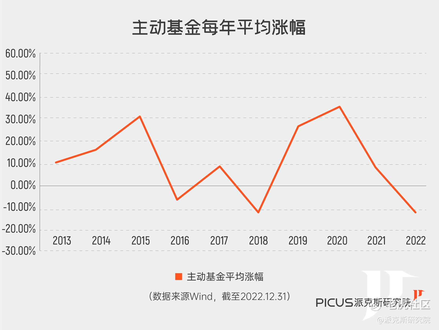 2022年,债券基金的表现一如既往的稳定,赚钱概率约82%,平均涨幅约1%;主动权益类基金表现较差,赚钱概率仅约3%,平均涨幅约-19%,为过去10年最差表现!
