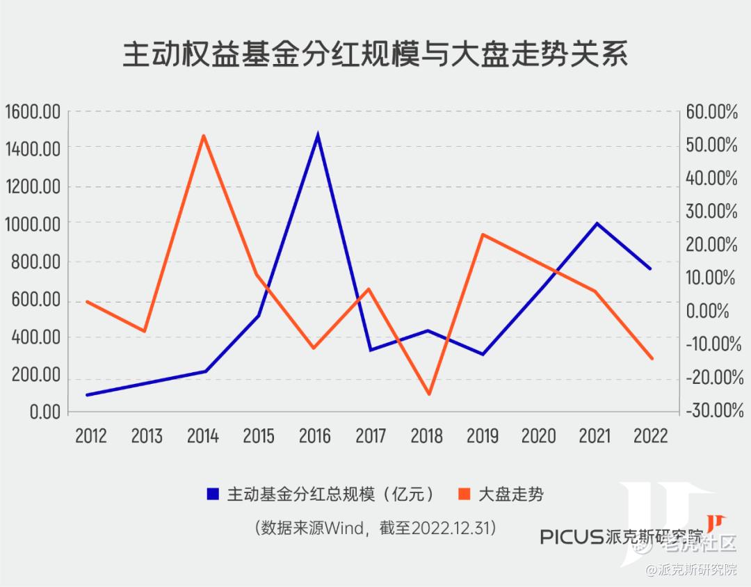实际上,分红的多少与市场行情成反比关系。分红多,需要提防市场后续走熊,比如2016年就出现了明显的背离,当年上证指数跌12%;若分红少,则可以期待市场后续回暖,比较明显的例子则是2019年。