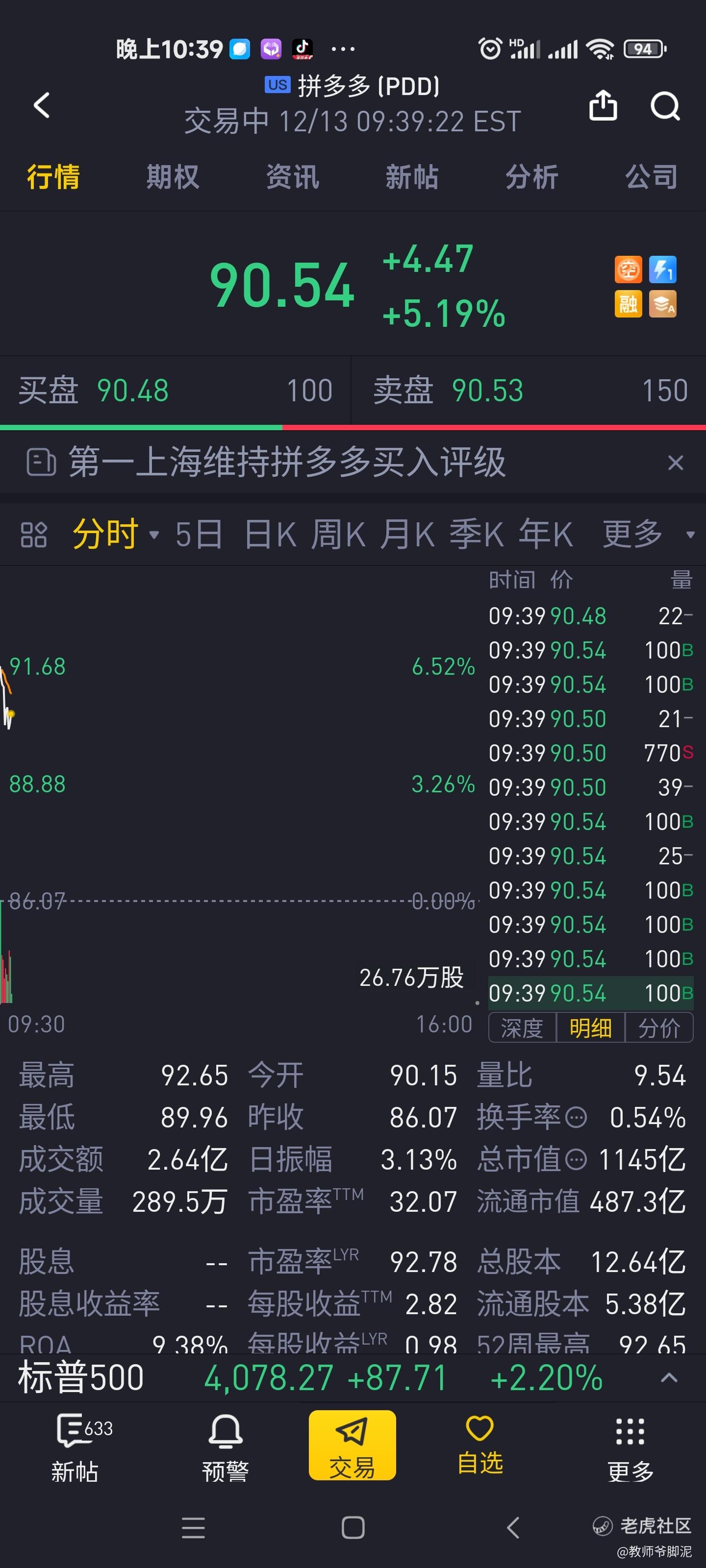 {"i18n":{"language":"zh_CN"},"detailType":1,"isChannel":false,"data":{"magic":2,"id":623046388,"tweetId":"623046388","gmtCreate":1670942429344,"gmtModify":1670942431683,"author":{"id":4127800648680800,"idStr":"4127800648680800","authorId":4127800648680800,"authorIdStr":"4127800648680800","name":"教师爷脚泥","avatar":"https://static.tigerbbs.com/f95eb932d0a090226b6e5ff02985a6e7","vip":1,"userType":1,"introduction":"","boolIsFan":false,"boolIsHead":false,"crmLevel":1,"crmLevelSwitch":0,"individualDisplayBadges":[],"fanSize":73,"starInvestorFlag":false},"themes":[],"images":[{"img":"https://static.tigerbbs.com/f3a5ff560daadc028d31134086347381","width":"1440","height":"3200"}],"coverImages":[{"img":"https://static.tigerbbs.com/f3a5ff560daadc028d31134086347381","width":"1440","height":"3200"}],"html":"<html><head></head><body><p><a href=\"https://laohu8.com/S/PDD\">$拼多多(PDD)$ </a>90.90卖了。睡觉!</p> <p><img src=\"https://static.tigerbbs.com/f3a5ff560daadc028d31134086347381\" tg-width=\"1440\" tg-height=\"3200\"></p></body></html>","htmlText":"<html><head></head><body><p><a href=\"https://laohu8.com/S/PDD\">$拼多多(PDD)$ </a>90.90卖了。睡觉!</p> <p><img src=\"https://static.tigerbbs.com/f3a5ff560daadc028d31134086347381\" tg-width=\"1440\" tg-height=\"3200\"></p></body></html>","text":"$拼多多(PDD)$ 90.90卖了。睡觉!","highlighted":1,"essential":1,"paper":1,"likeSize":3,"commentSize":5,"repostSize":0,"favoriteSize":0,"link":"https://laohu8.com/post/623046388","repostId":0,"isVote":1,"tweetType":1,"viewCount":1362,"commentLimit":10,"likeStatus":false,"favoriteStatus":false,"reportStatus":false,"symbols":["PDD"],"verified":2,"subType":0,"readableState":1,"langContent":"CN","currentLanguage":"CN","warmUpFlag":false,"orderFlag":false,"shareable":true,"causeOfNotShareable":"","featuresForAnalytics":[],"commentAndTweetFlag":false,"andRepostAutoSelectedFlag":false,"upFlag":false,"length":28,"xxTargetLangEnum":"ZH_CN"},"commentList":[{"id":7781730,"commentId":"7781730","gmtCreate":1670943338582,"gmtModify":1670943352268,"authorId":3580820422981796,"author":{"id":3580820422981796,"idStr":"3580820422981796","authorId":3580820422981796,"name":"姚姚会理财","avatar":"https://static.laohu8.com/default-avatar.jpg","vip":1,"crmLevel":2,"crmLevelSwitch":0,"individualDisplayBadges":[]},"repliedAuthorId":0,"objectId":623046388,"objectIdStr":"623046388","type":1,"supId":0,"supIdStr":"0","prevId":0,"prevIdStr":"0","content":"92.7了[笑哭]","text":"92.7了[笑哭]","html":"92.7了[笑哭]","likeSize":0,"commentSize":1,"subComments":[{"id":7781770,"commentId":"7781770","gmtCreate":1670945391977,"gmtModify":1670945405638,"authorId":4127800648680800,"author":{"id":4127800648680800,"idStr":"4127800648680800","authorId":4127800648680800,"name":"教师爷脚泥","avatar":"https://static.tigerbbs.com/f95eb932d0a090226b6e5ff02985a6e7","vip":1,"crmLevel":1,"crmLevelSwitch":0,"individualDisplayBadges":[]},"repliedAuthorId":0,"objectId":623046388,"objectIdStr":"623046388","type":1,"supId":7781730,"supIdStr":"7781730","prevId":0,"prevIdStr":"0","content":"刚刚改成90.9。原来是92.88。计划没有变化快 [流泪]","text":"刚刚改成90.9。原来是92.88。计划没有变化快 [流泪]","html":"刚刚改成90.9。原来是92.88。计划没有变化快 [流泪]","disclaimerType":0}],"verified":10,"allocateAmount":0,"commentType":"valid","coins":0,"score":0,"disclaimerType":0},{"id":7781768,"commentId":"7781768","gmtCreate":1670945301510,"gmtModify":1670945314513,"authorId":4127800648680800,"author":{"id":4127800648680800,"idStr":"4127800648680800","authorId":4127800648680800,"name":"教师爷脚泥","avatar":"https://static.tigerbbs.com/f95eb932d0a090226b6e5ff02985a6e7","vip":1,"crmLevel":1,"crmLevelSwitch":0,"individualDisplayBadges":[]},"repliedAuthorId":0,"objectId":623046388,"objectIdStr":"623046388","type":1,"supId":0,"supIdStr":"0","prevId":0,"prevIdStr":"0","content":"挂了89.01买入。94.28卖空。睡觉","text":"挂了89.01买入。94.28卖空。睡觉","html":"挂了89.01买入。94.28卖空。睡觉","likeSize":0,"commentSize":0,"subComments":[],"verified":10,"allocateAmount":0,"commentType":"valid","coins":0,"score":0,"disclaimerType":0}],"isCommentEnd":false,"isTiger":false,"isWeiXinMini":false,"url":"/m/post/623046388"}