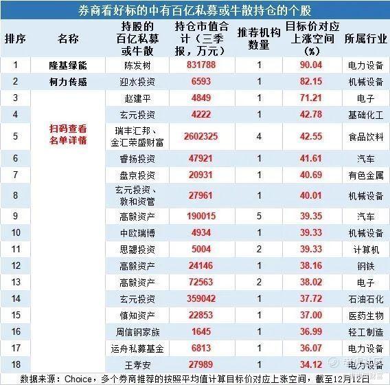 进一步研究发现,近一个月券商给出目标价对应当前(12月12日)价格目标涨幅空间超30%的个股当中,有18家公司的三季报显示,其前十大流通股东出现了百亿私募或者牛散的身影。