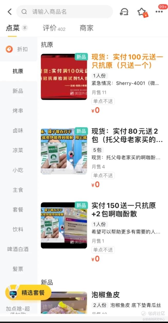 除此之外,还有部分商家,将抗原用在了招揽生意方面。比如,在佛山开SPA馆的戴老板,就在网上发文表示:“成为SPA馆会员后,在每月的会员日到店,可免费领取抗原试纸。”同时,还有餐饮商家,在美团外卖上打出广告:“实付满100元,送抗原一份。”