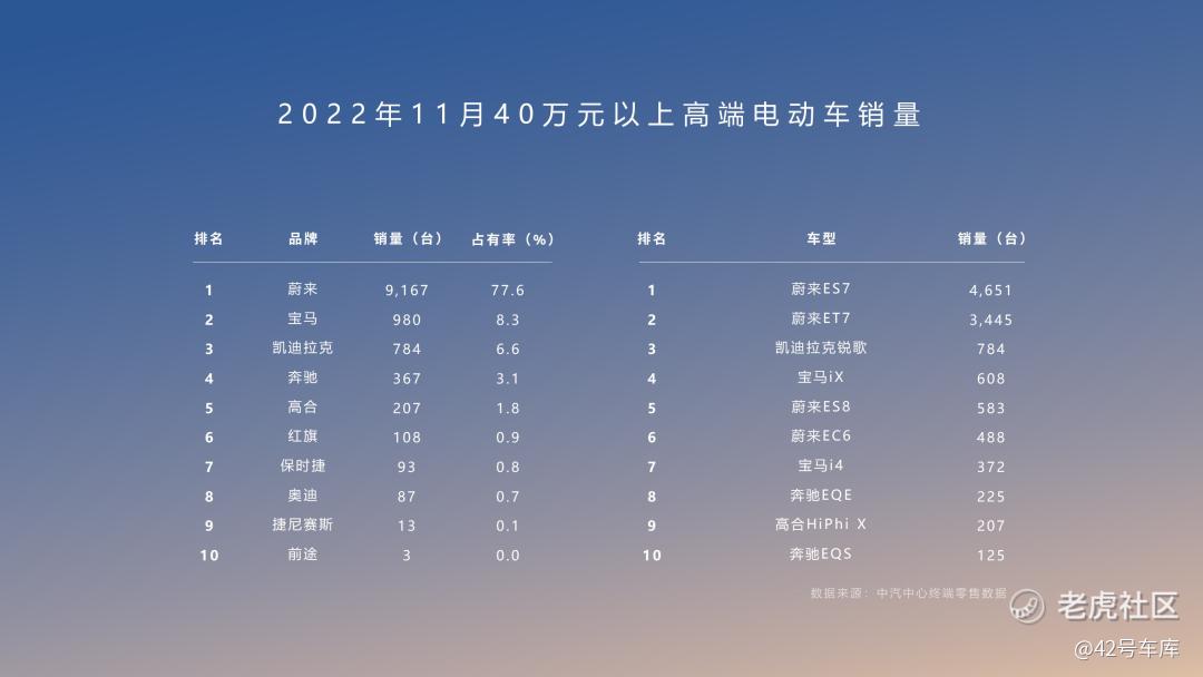 如果按 40 万以上纯电高端产品销量细分,蔚来凭借 ET7 和 ES7 占有了这个市场 77.6% 的份额,远超传统车企。