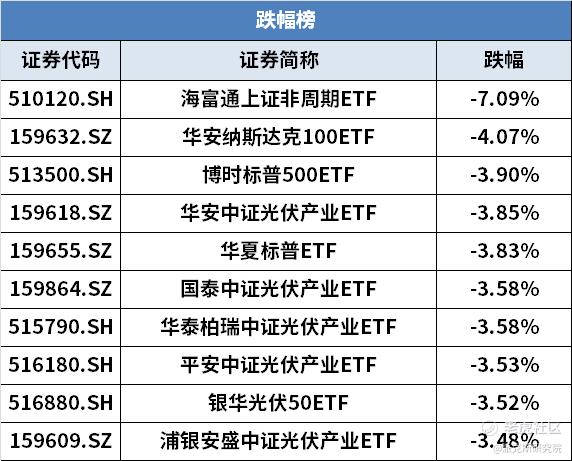 排名第一的是海富通上证非周期ETF,下跌7.09%,跌幅较大的原因是规模较小,盘中交易放大了波动,该基金持仓主要集中在食品饮料、电力设备行业,且以龙头居多。