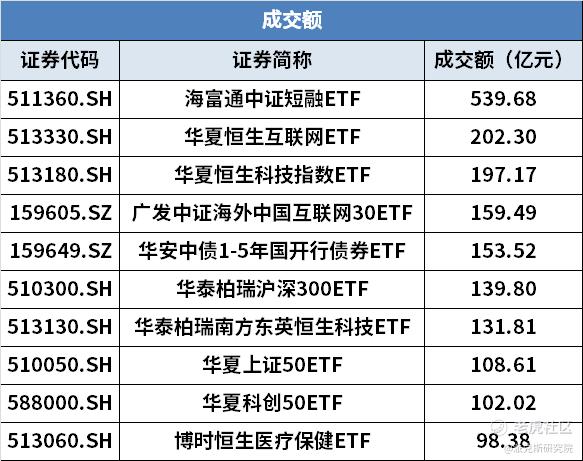 排名第一的依然为海富通中证短融ETF,成交额539.68亿,由于具有一定的稀缺属性(低费率、灵活性、稳定性),已经连续十五周排名榜首。
