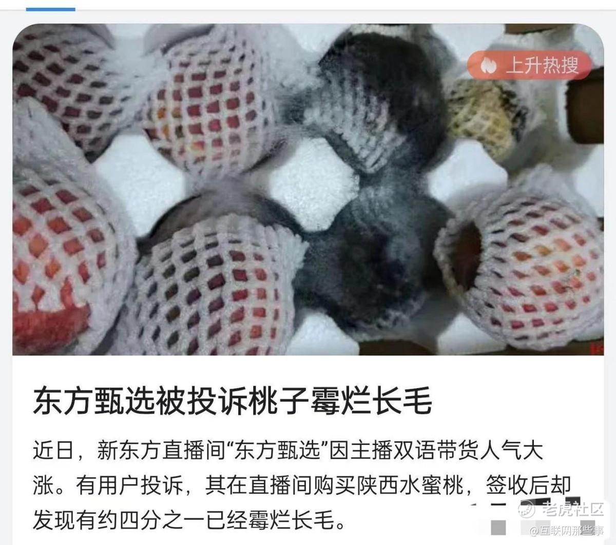 2022年6月,东方甄选的桃子发现有霉烂长毛的情况,对此新东方在线已全额退款给消费者,同月,中消协发布的618消费维权舆情分析报告中也有东方甄选的身影。