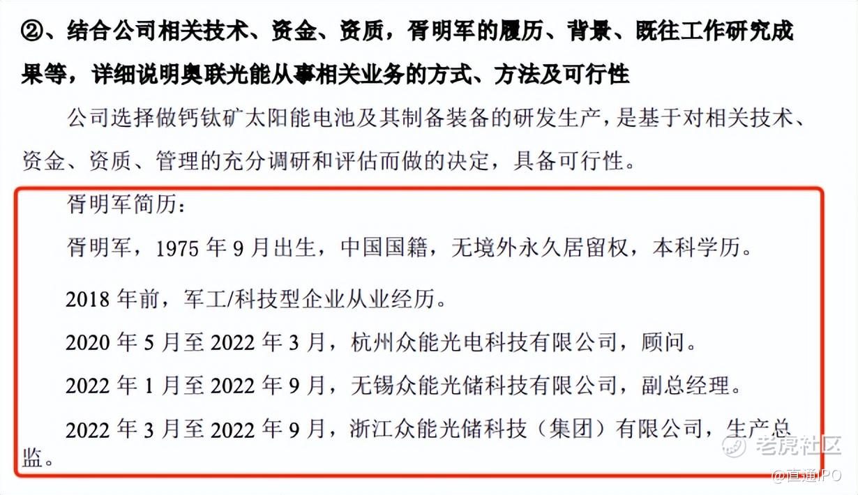 杭州众能光电提到,奥联电子回复交易所的“完成100X100mm钙矿电池组件实验线全部工艺设备国产化研制”这一项目,在胥明军入职前已完成全部设计,他本人并未参与。还有部分指导工作胥明军仅参与相关项目讨论。