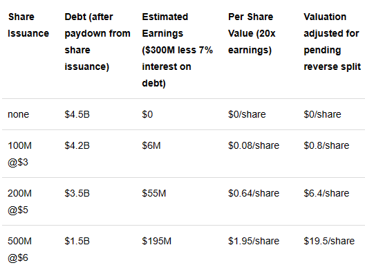 The answer for AMC may be further share issuance, this may be anti-dilutive if it can be done at high enough prices. Assuming APE shares convert the company has 1.5 billion shares out and no real earnings if you believe the projections above. However, that can change with share issuance. The projections below assume 7% interest and that all earnings from any share issuance pay down debt.