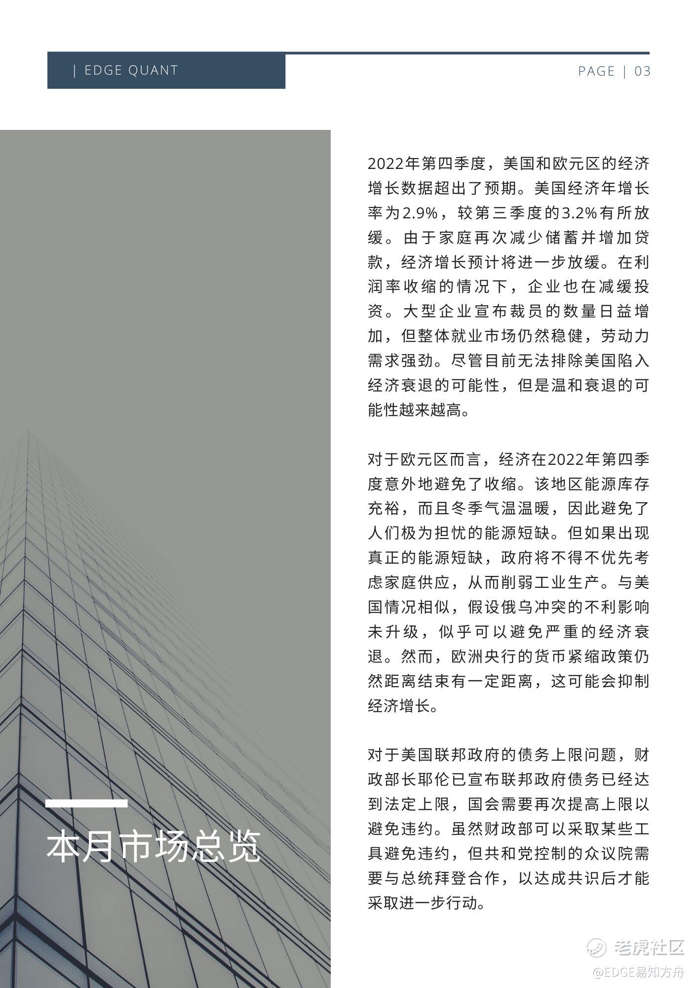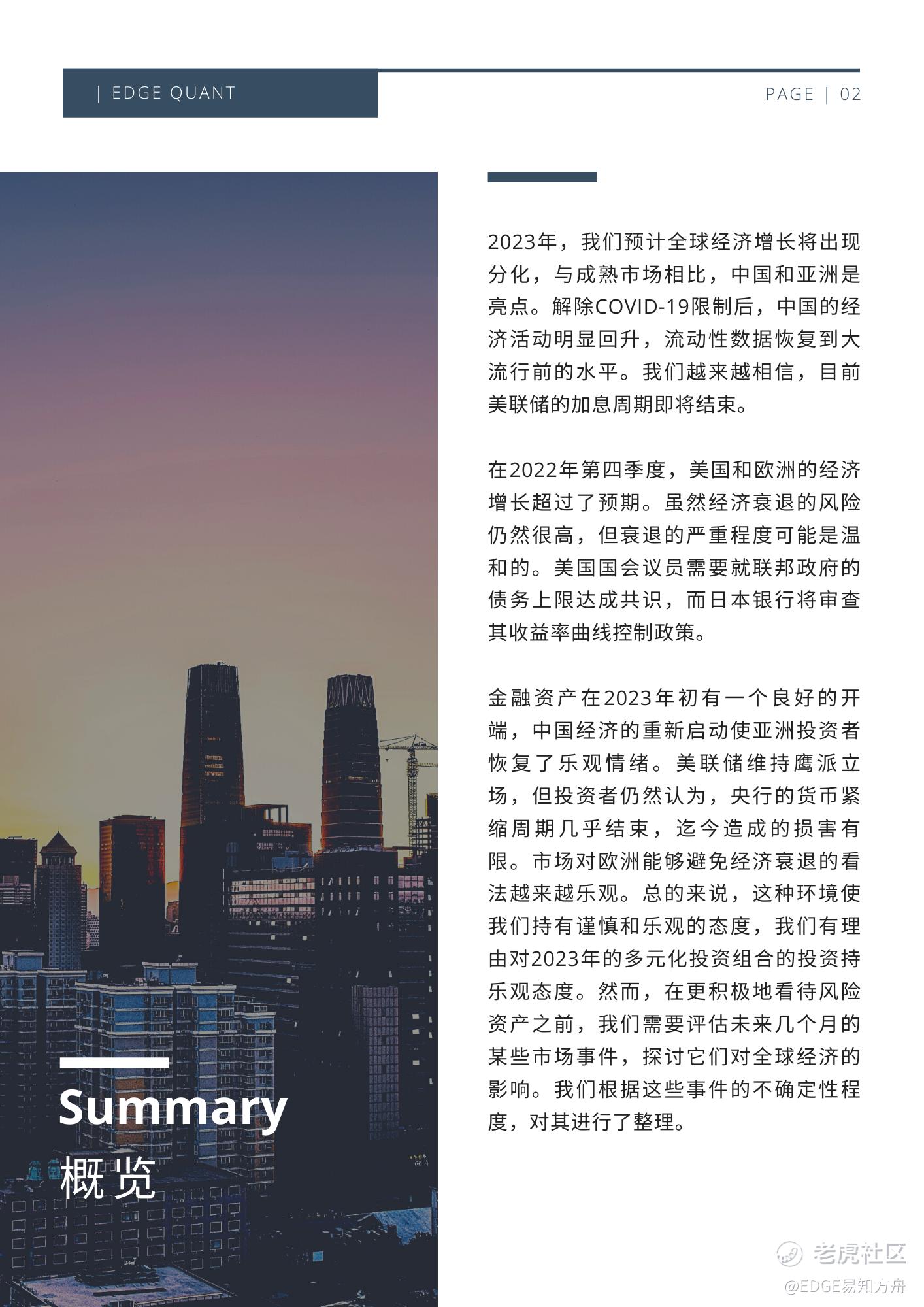 金融资产在2023年初有一个良好的开端,中国经济的重新启动使亚洲投资者恢复了乐观情绪。美联储维持鹰派立场,但投资者仍然认为,央行的货币紧缩周期几乎结束,迄今造成的损害有限。市场对欧洲能够避免经济衰退的看法越来越乐观。总的来说,这种环境使我们持有谨慎和乐观的态度,我们有理由对2023年的多元化投资组合的投资持乐观态度。然而,在更积极地看待风险资产之前,我们需要评估未来几个月的某些市场事件,探讨它们对全球经济的影响。我们根据这些事件的不确定性程度,对其进行了整理。