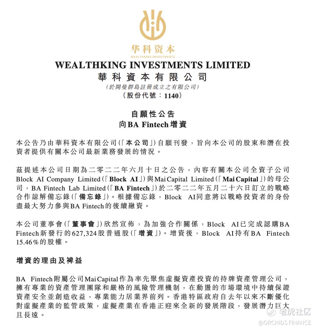 $华科资本(01140)$ 是一家在香港联交所主板上市的跨境跨界投资平台,投资组合涵盖多个领域的上市及非上市公司。根据港交所的材料披露,作为MaiCapital 的现有股东,通过本轮增资后华科资本将持有MaiCapital 15.46%的股权,同意将以战略投资者的身份,尽最大努力参与BA Fintech的后续融资。