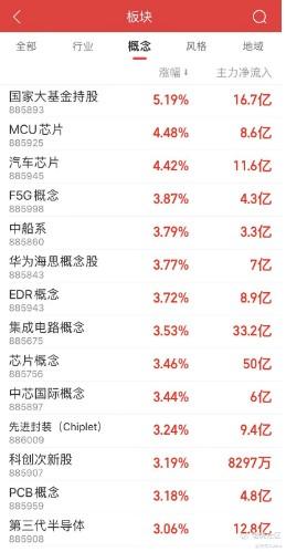 截止2月9日,当日涨幅榜中领涨概念中,除了中船系属于军工行业,其他清一色的泛科技行业,比如国家大基金持股概念、MCU芯片概念、汽车芯片概念、集成电路概念、先进封装概念等。