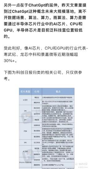 在上一篇2月9日的文章中见下图(AI芯片受市场热捧,今年半导体芯片走势分析),主要讲了随着ChatGpt聊天机器人的火热,点燃AI产业化迈向大模型时代,有力于助推应用算力和算法所需的芯片市场,尤其是AI、CPU、GPU、FPGA、DPU等芯片。