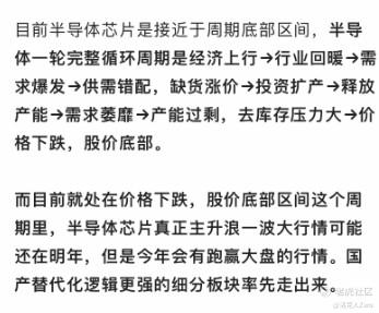 关于半导体芯片周期变化,之前文章分析过(见下图):景气度高,国产替代化强的领域股价先走出了,今年因为只是周期见底,整体会有跑赢大部分行业的行情,但真正的估值和盈利扩张的戴维斯双击的主升浪行情可能在明年。