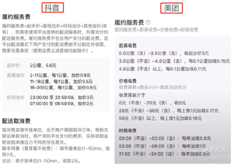 在平台费用方面,可以分为佣金和履约服务费两部分。佣金部分,抖音外卖试点期间的抽佣比例仅为2.5%,而另外两家的抽佣比例却能高达20%,如此优渥的待遇必定会吸引大量商家申请入驻。不过低佣金的优惠机制一般仅存在于平台起步阶段,抖音官方也无法保证后续多长时间能保持低抽佣模式。
