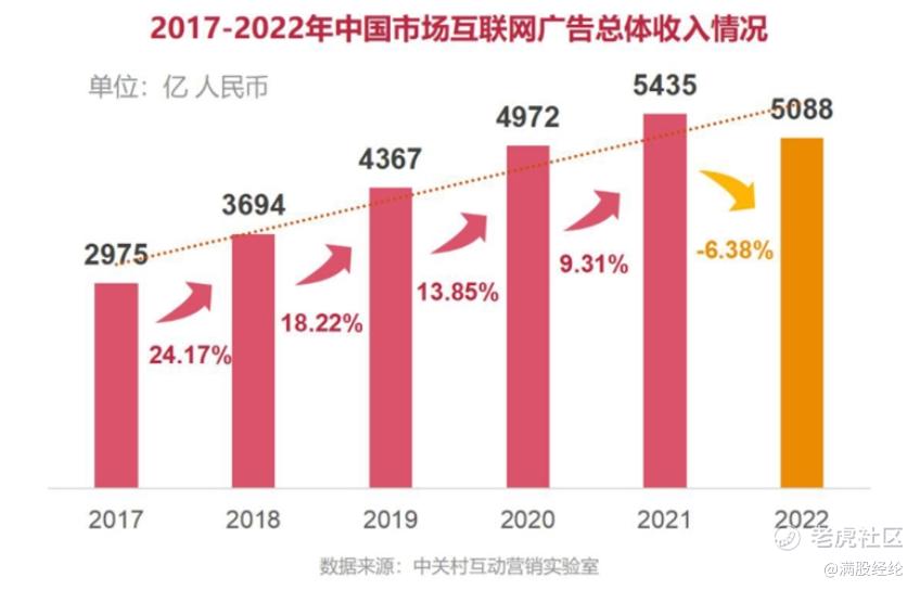 从外部环境来看,2022年广告市场有所衰退。广告营销的热度通常与人们的消费水平高度相关。2022年国际形势严峻、疫情反复,受此影响人们的收入、消费水平均有所降低,因此广告市场受到较大冲击。据中关村互动营销实验室发布的《2022中国互联网广告数据报告》显示,2022年互联网广告收入较去年不升反降,下跌了6.38%。