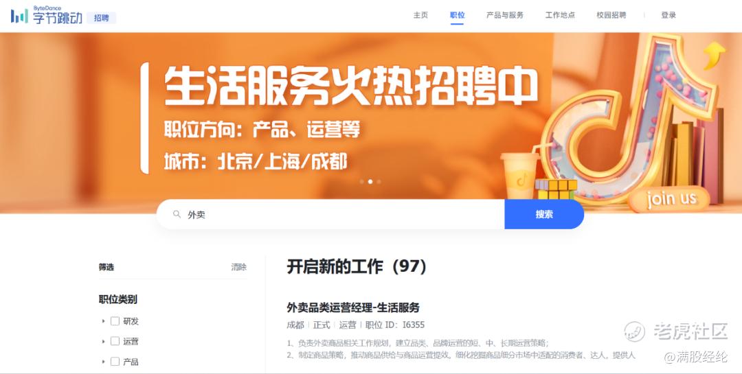 2021年7月,抖音进行首次外卖业务试水,内测“心动外卖”小程序。2022年8月,抖音宣布与饿了么达成合作,喊出了在短视频时代“即看、即点、即达”的本地生活服务体验。12月,抖音与达达、顺丰同城、闪送达成合作,为抖音上的生活服务商家提供同城配送服务。现在,在字节跳动的招聘官网检索“外卖”二字,能够出现97个相关职位,涵盖了外卖业务所需要的产品、销售、运营、市场、研发等岗位。