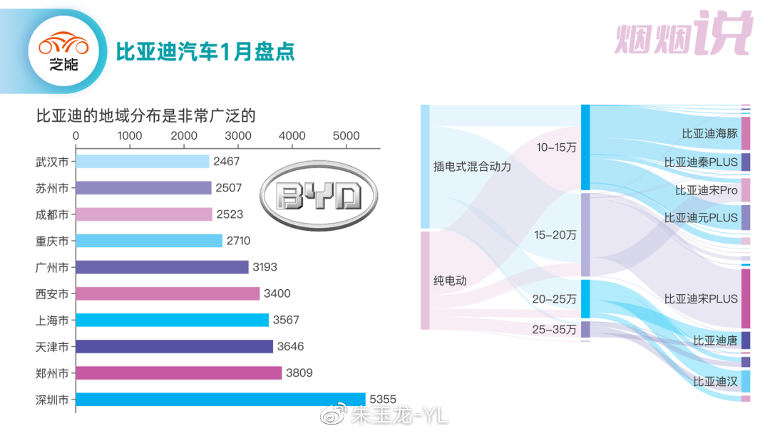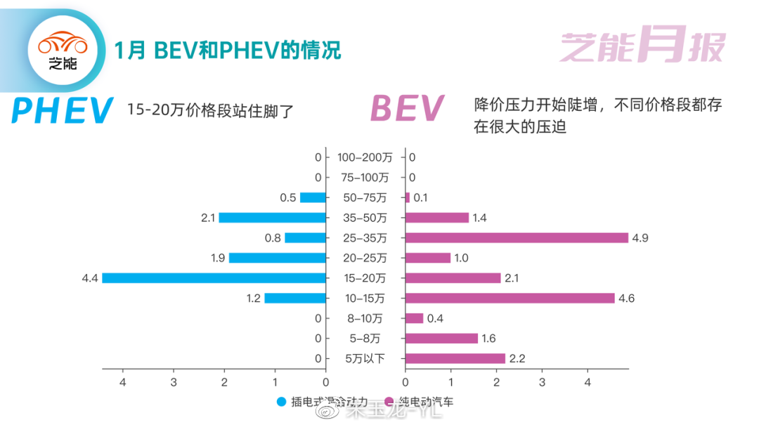 ● 渗透率来看:1月为新能源汽车23.3%,其中BEV 14.6%,插电混动8.7%。有趣的事情是PHEV对BEV的比值是1:1.67, 我估计到年中可能破1:1.4。