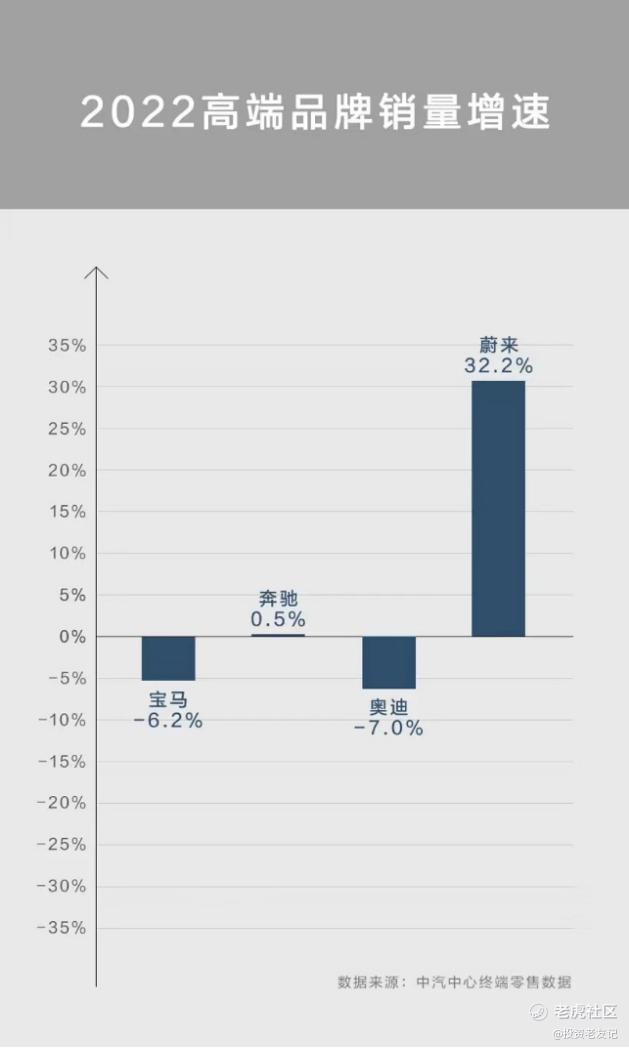 另外还有十分关键的电动汽车板块。2022年,中国新能源汽车市场渗透率已超过20%。其中在高端品牌里,国内新能源汽车与传统豪华油车发生抢夺。从高端汽车品牌2022年的整体销量来看,宝马和奥迪相比去年都是下滑的,奔驰也只有0.5%的增长。而咱们的中国品牌蔚来在高端电车这一赛道里表现出现了强劲的增长势头。