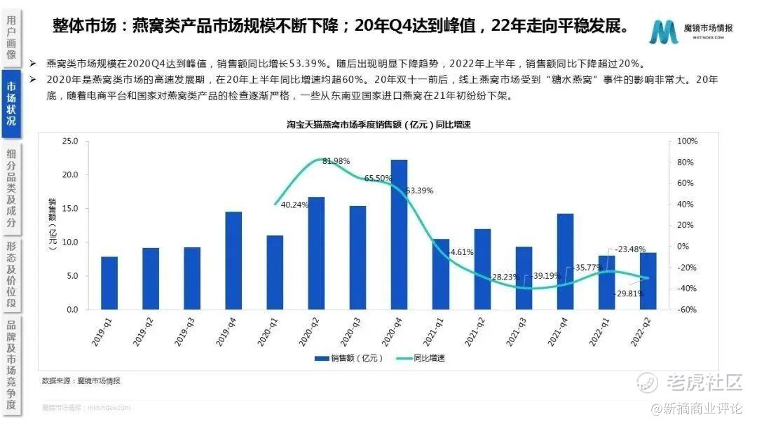 魔镜市场情报统计的数据显示,2020年Q4,中国线上燕窝市场规模达到了超20亿元的峰值,此后就节节下探,2022年上半年,销售额同比下降超20%。